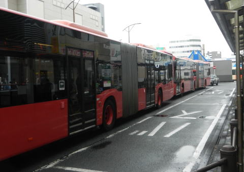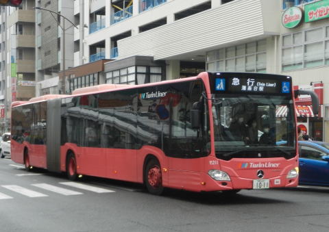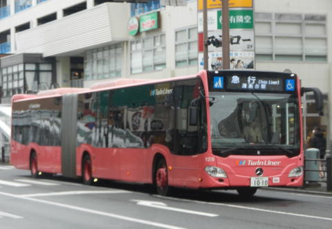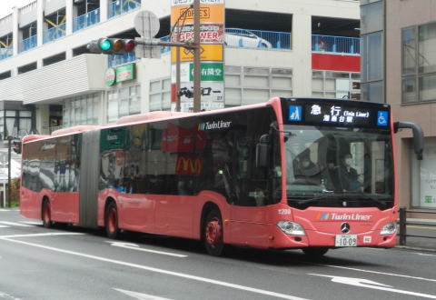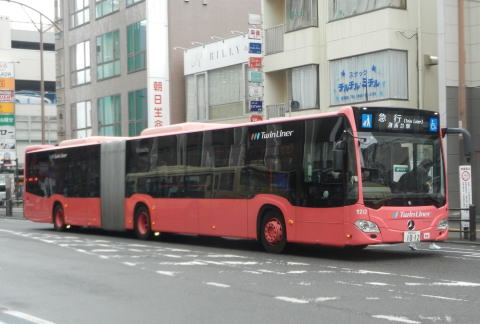 ▲ツインライナー使用の急行便も運用。こちらも「臨時」などの表記はなく行先表示も定期便と同じですね。慶応大学の臨時バスにおいても連接バスの威力が遺憾なく発揮されます。