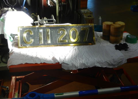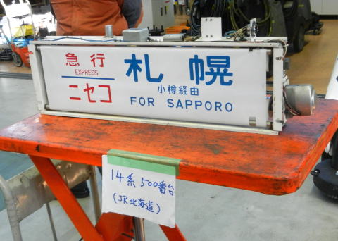 ▲SL研修庫にて。図らずもSL用機関車がパーツを分解しての全般検査を受けていたため、SLのいろんなパーツが見られるという何とも贅沢なものでした。客車用の方向幕は、JR線の行先を出して展示されており、大変マニアックでした。