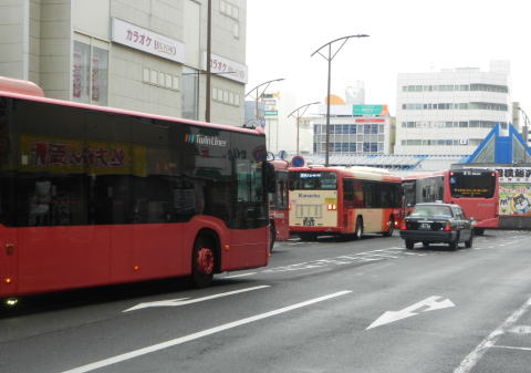 ▲ツインライナー使用の急行便も運用。こちらも「臨時」などの表記はなく行先表示も定期便と同じですね。慶応大学の臨時バスにおいても連接バスの威力が遺憾なく発揮されます。